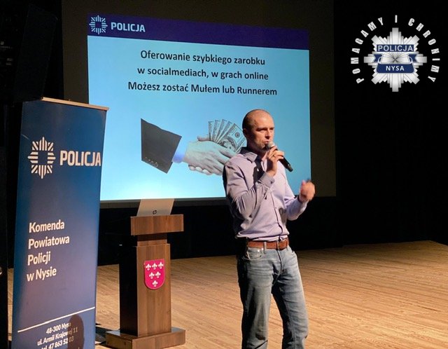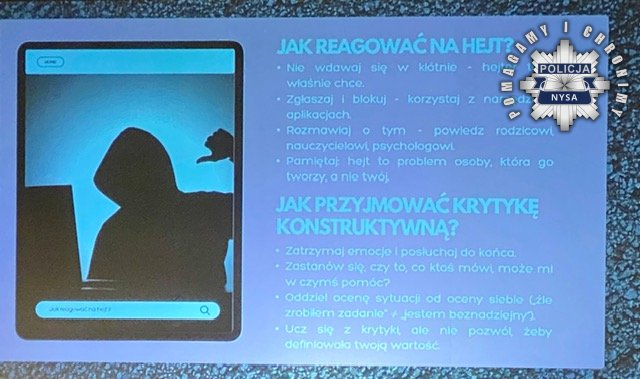 Drugim prelegentem był st. asp. Adrian Kulas – Naczelnik Wydziału do Walki z Przestępczością Gospodarczą Komendy Powiatowej Policji w Nysie. Policjant poruszył tematy związane z bezpieczeństwem w Internecie. Przypomniał jak bezpiecznie poruszać się w wirtualnym świecie, a także jak łatwo paść ofiarą oszustów i dlaczego różne hasła są tak ważne w różnych aplikacjach zwłaszcza w bankowości internetowej. Wyjaśnił również, czym jest hejt i jak łatwo stać się jego ofiarą w sieci.