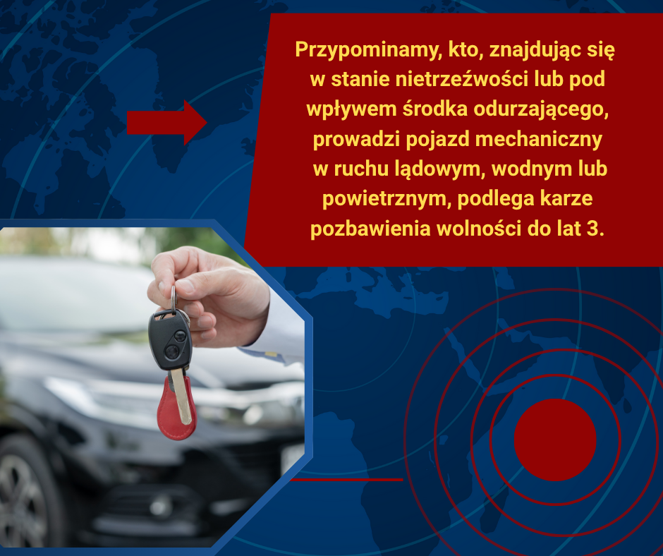 Przypominamy, że alkohol negatywnie działa na organizm człowieka, prowadzi do utraty zdolność koncentracji i poczucia rzeczywistości. Powoduje wydłużenie zdolności oceny sytuacji i wpływa na czas reakcji. Nigdy nie wsiadaj za kierownicę po alkoholu! Pijany kierowca to ogromne zagrożenie dla wszystkich uczestników ruchu drogowego. Kierowco, bądź rozsądny!
