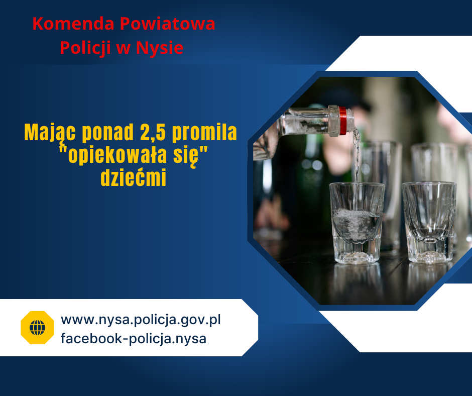 Nyscy dzielnicowi podczas swojej codziennej służby, odwiedzili mieszkanie jednej z rodzin, gdzie okazało się, że matka sprawująca opiekę nad dwójką dzieci jest nietrzeźwa. Badanie wykazało, że kobieta miała ponad 2,5 promila alkoholu w organizmie. Niespełna 2-letni chłopiec i 15-lenia dziewczynka zostali przekazani pod opiekę rodzinie, a sprawą nieodpowiedzialnej matki zajmie się sąd. Grozi jej kara nawet 5 lat więzienia.