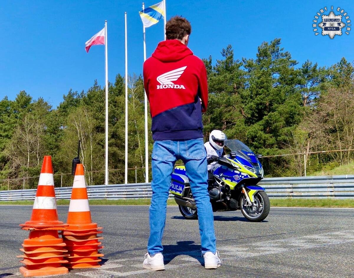 W dniach 21 i 22 kwietnia 2026 br., na Torze Poznań odbyło się specjalistyczne szkolenie z zakresu techniki jazdy motocyklem służbowym, zorganizowane przez Automobilklub Wielkopolski w porozumieniu z Komendantem Wojewódzkim Policji w Opolu nadinsp. Magdaleną Nguyen-Fudalą. W szkoleniu uczestniczył również nasz funkcjonariusz z Wydziału Ruchu Drogowego komendy w Nysie, mł. asp. Piotr Derka, który doskonalił swoje umiejętności jazdy motocyklem służbowym marki BMW. Program obejmował m.in. jazdę szybką i pościgową z użyciem sygnałów świetlnych, technikę hamowania, pokonywanie zakrętów, awaryjne omijanie przeszkód oraz praktyczne wykorzystanie motocykla w codziennej służbie.